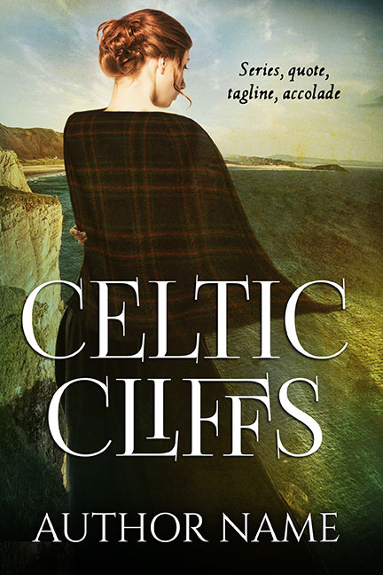 Historical red haired woman standing in wool shawl by cliffs overlooking ocean premade book cover