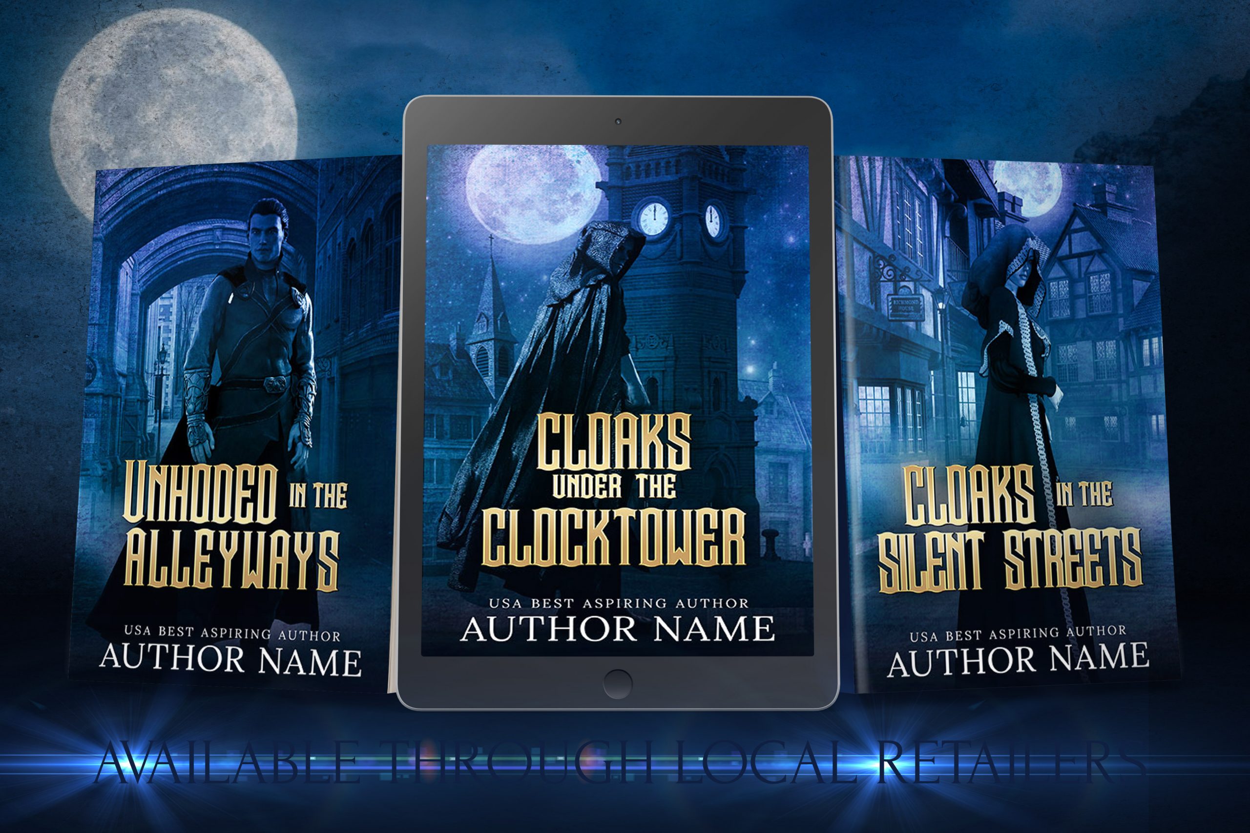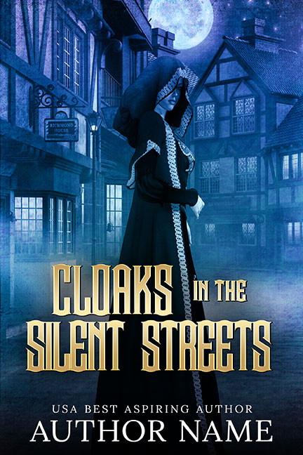 This premade book cover features a solitary clocked figure standing in a hooded cloak in an old town at night. This cover can be used for a historical drama, mystery, fantasy, murder mystery, or historical romance. This has been set up for a series and more can be added on. Unlimited print run.