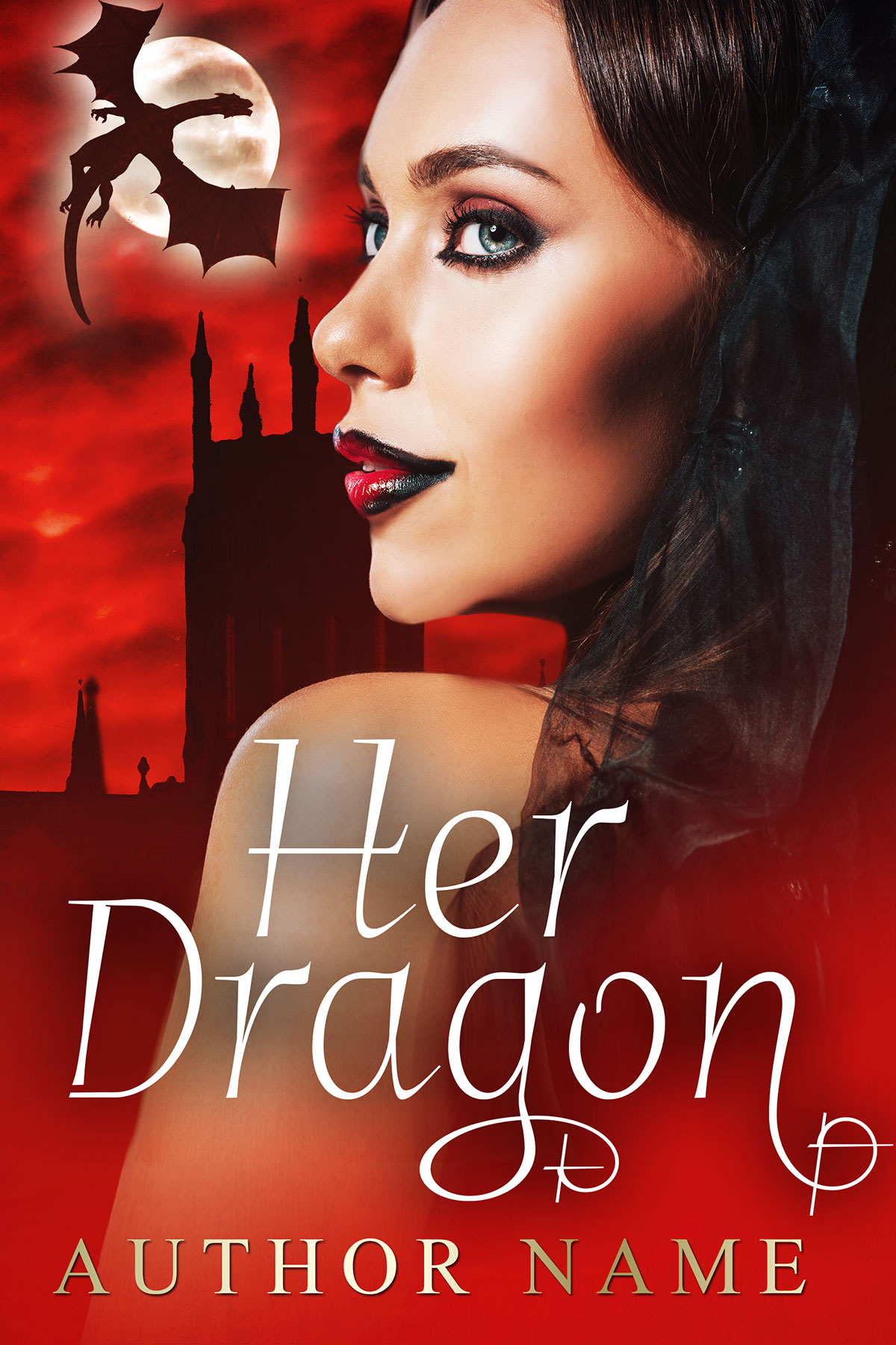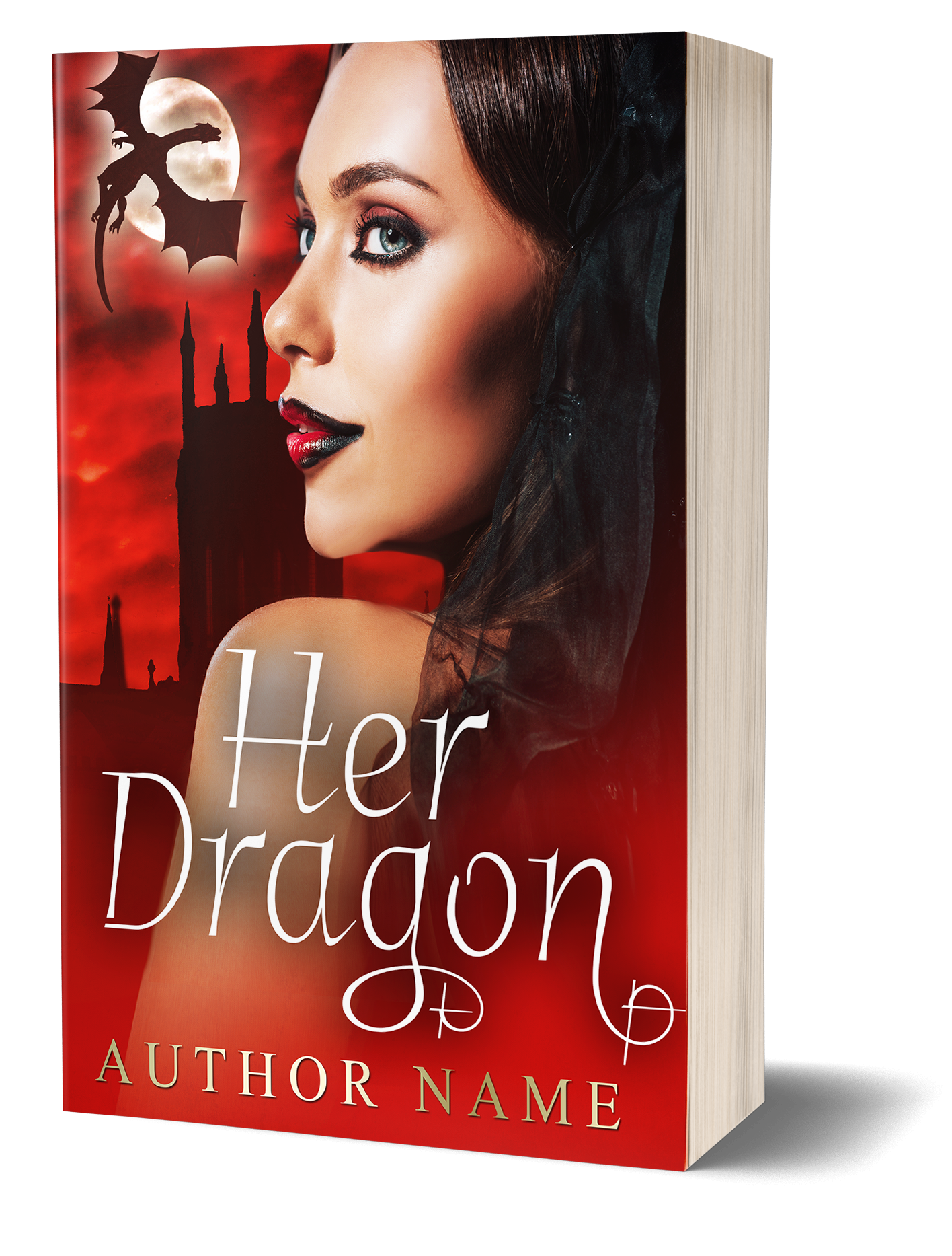 Fantasy woman over red background with a castle, moon and dragon premade book cover