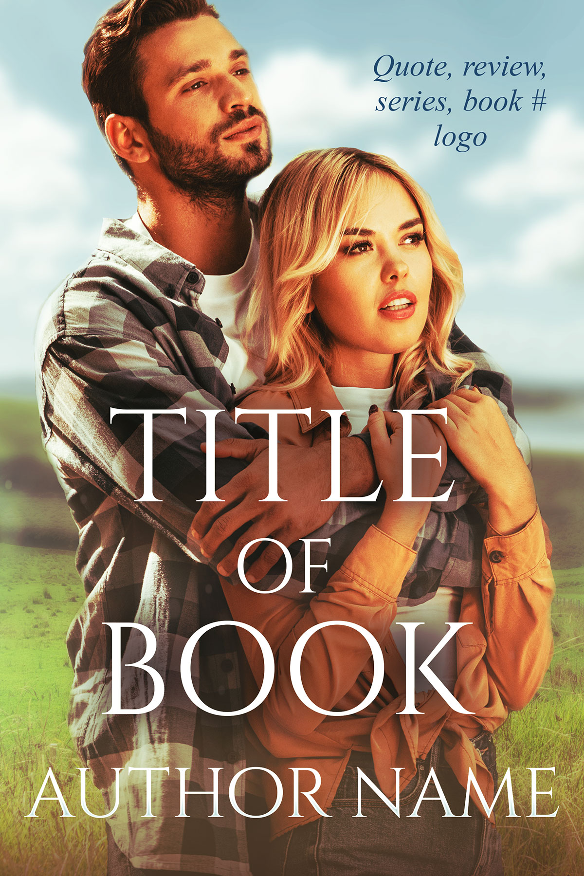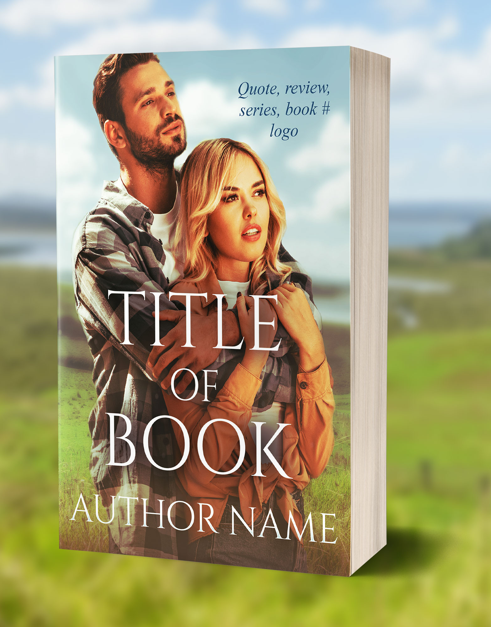 A cover of a man and woman embracing overlooking gorgeous countryside